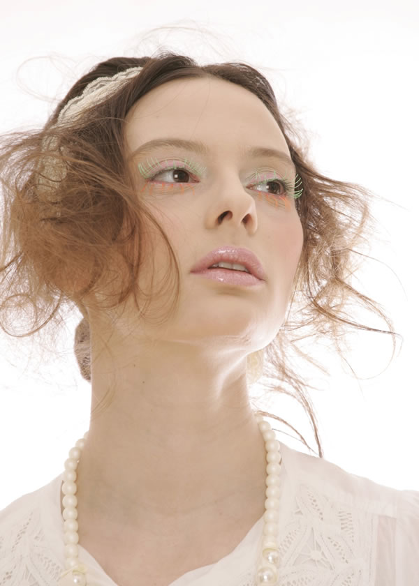瞼にピンク・グリーンをのぞかせてホワイトカラーをまぶしたアイシャドー。